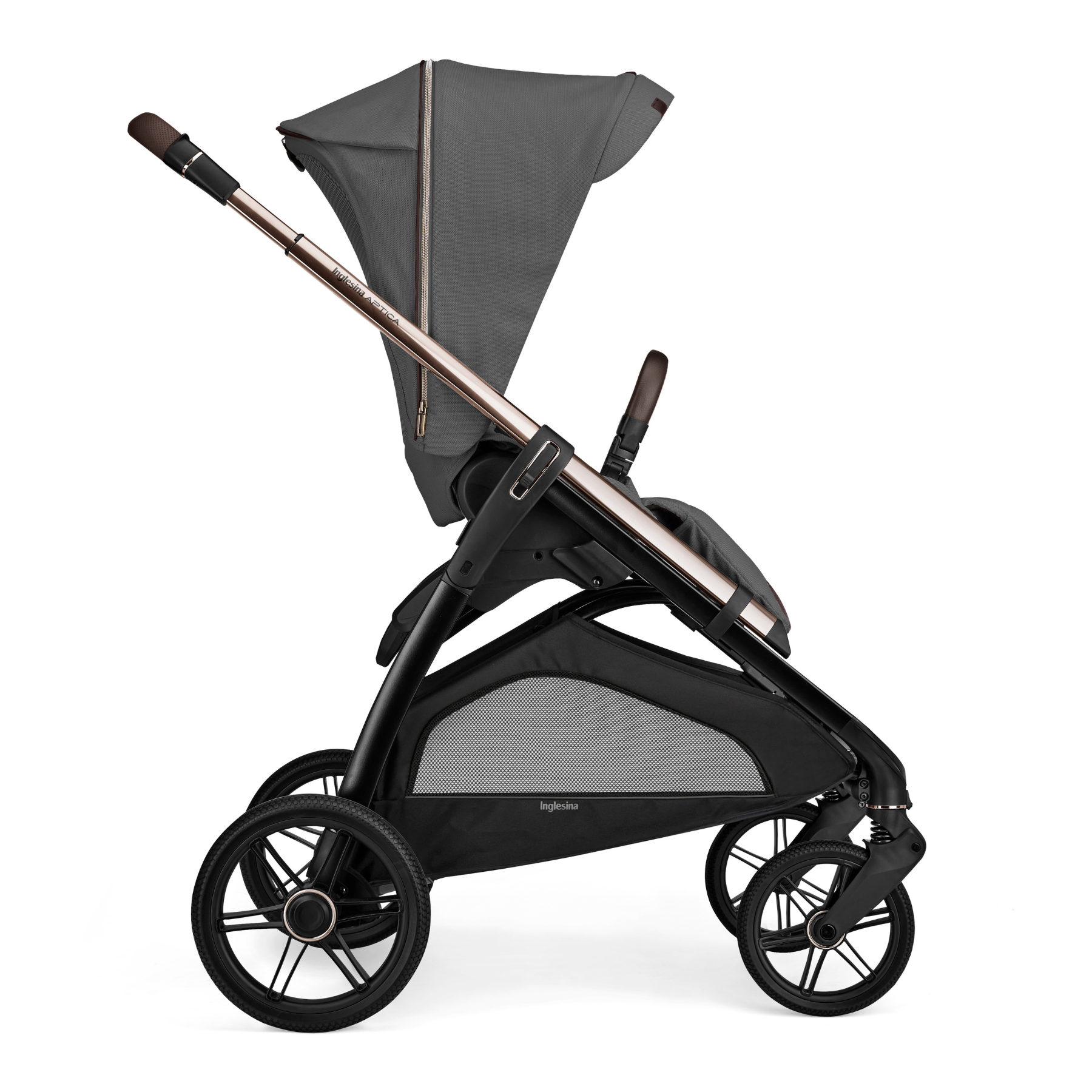 The Aptica stroller frame features all 4-wheel suspension, with rubber never flat wheels for high abrasion resistance and impact strength. The new rubber cushioned wheels with ball bearings and polyurethane threads (front diameter 7.5'' and rear 10.2'') guarantee a smooth ride and the best comfort for the baby.